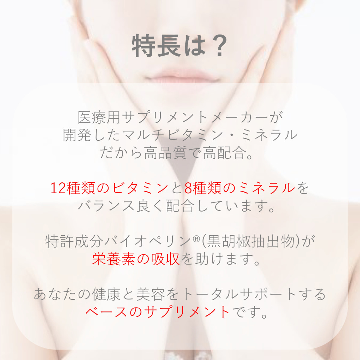 ビタミンA:680.9µg、β-カロテン:8982.4µg、ビタミンC:390mg、ビタミンD:4.9µg、ビタミンE:110mg、ビタミンB1:46.9mg、ビタミンB2:20mg、ナイアシン:78mg、ビタミンB6:46.9mg、葉酸:315.6µg、ビタミンB12:70µg、パントテン酸:154.3mg、カルシウム:32.5mg、マグネシウム:189.3mg、ヨウ素:29.8µg、亜鉛:8mg、セレン:78.1µg、銅:0.8mg、マンガン:2.3mg、クロム:90.3µg、シトラスエキス:50.8mg、黒胡椒抽出物:5mg