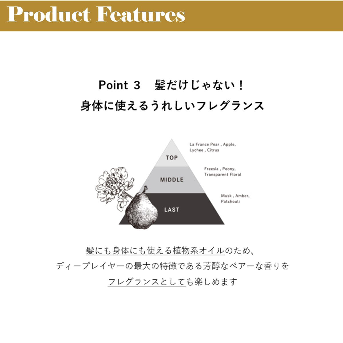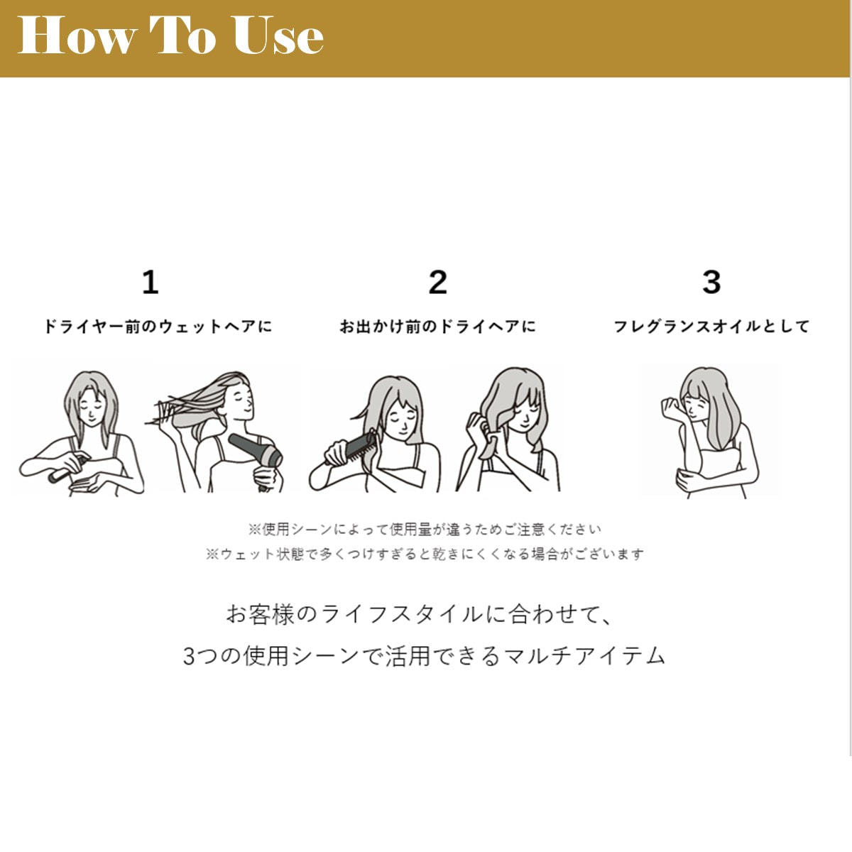 アウトバスオイルとしてはもちろん、ヘアスタイリングやフレグランス(ボディに)にもご使用いただけます。