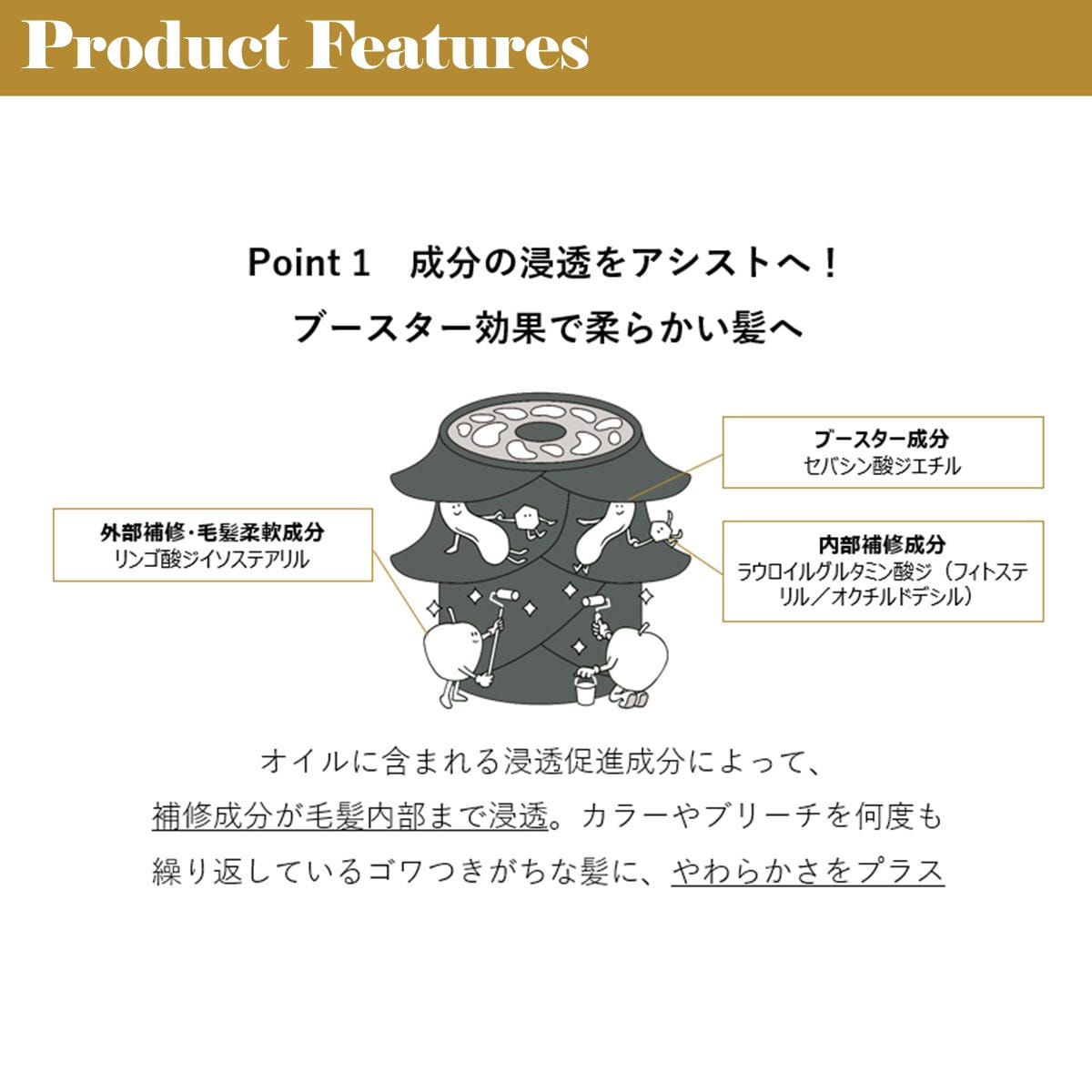 PG、エタノール、水、ミリスチルアルコール、セトリモニウムクロリドベタインヒドロキシエチルウレア、バオバブ種子エキス、ゼイン、シクロヘキサン-1,4-ジカルボン酸ビスエトキシジグリコール、加水分解ケラチン(羽毛)、ベヘントリモニウムクロリド、イソステアリルグリセリル、ジラウロイルグルタミン酸リシンNa、乳酸、イソプロパノール、DPG、香料