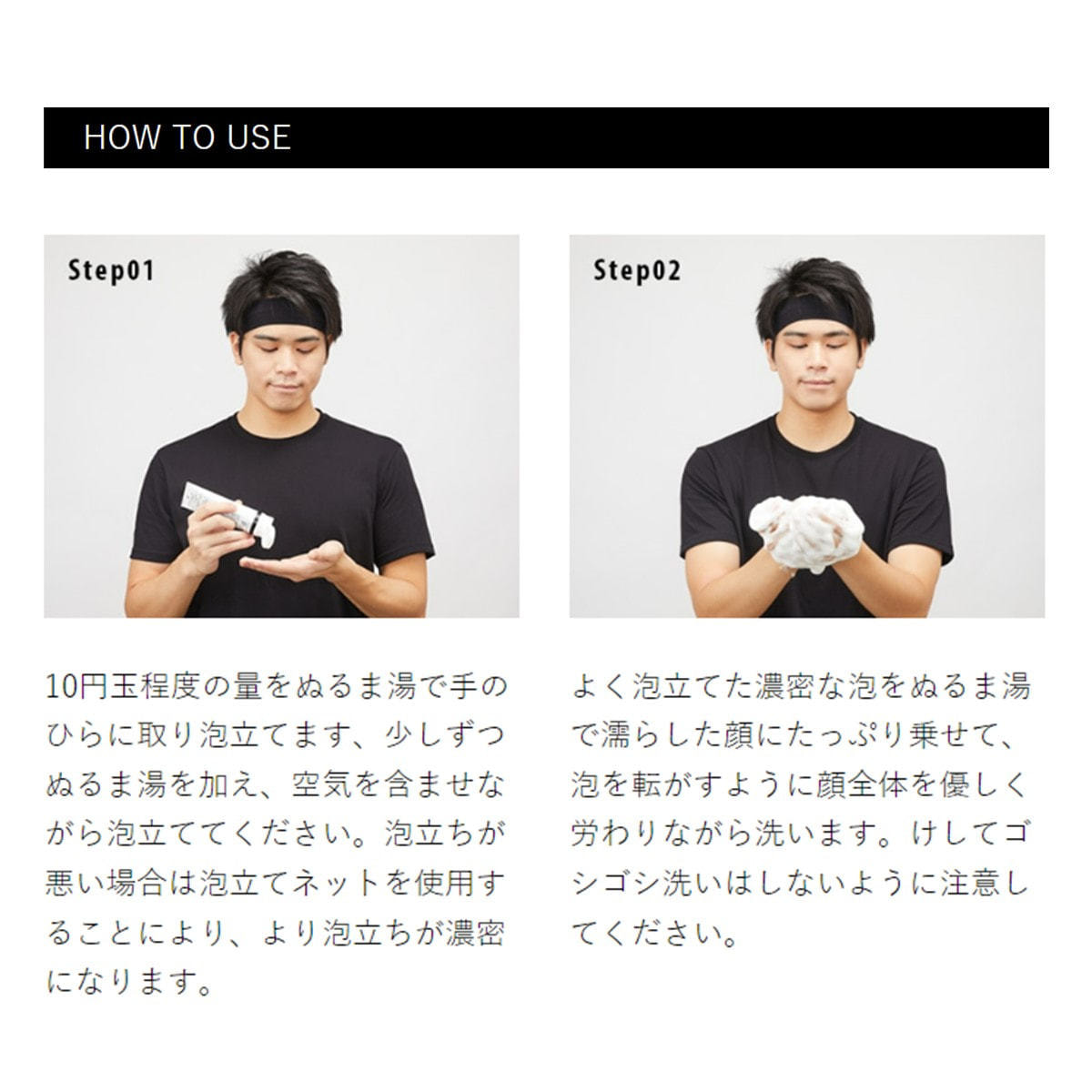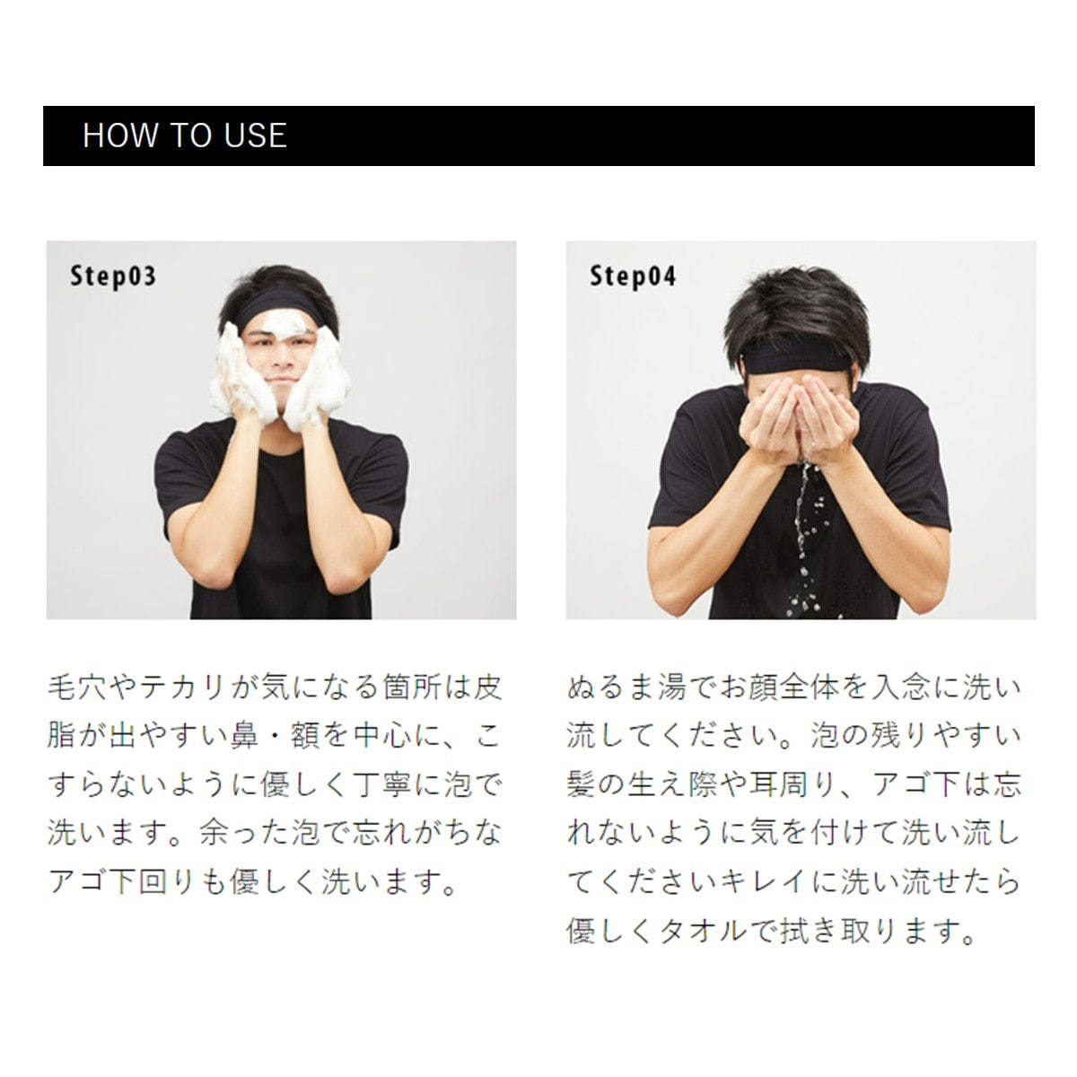 環境に配慮した生石鹸の成分で作り出す洗顔料は洗顔後の排水から川や海など環境への影響が懸念される成分を使用していません。奇跡の成分EGF、FGFを配合しながらも生石鹸の弾力ある泡とマショマロのような使用感で男性特有の余分な皮脂や不要な角質、臭いなどの汚れをきれいに洗い流し、肌にうるおい、透明感のある明るい輝きをもたらします。毎日のお手入れで肌をすっきりと清潔に整えるとともに、清らかで明るく輝く肌に導きます。