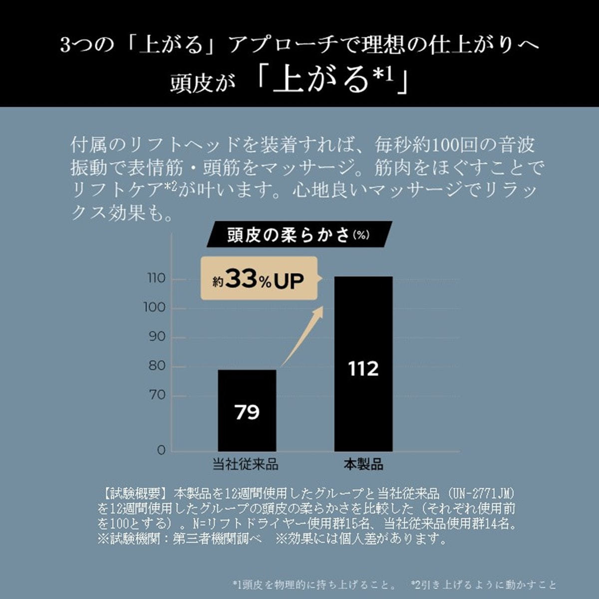毎秒約100回の音波タッピング。 表情筋と頭筋を刺激 付属の「リフトヘッド」を装着すれば、イオン導入*2と音波タッピングによるスキンケアが可能に。イオンの力を肌と頭皮に届けながら、毎秒約100回の音波振動で表情筋・頭筋を刺激してリフトケア*3を叶えます。