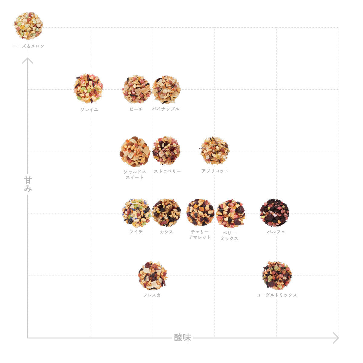 加糖ドライストロベリー(タイ製造)、有機ハイビスカス、加糖ドライパパイヤ、加糖ドライクランベリー、トンプソンレーズン、加糖ドライブルーベリー、砂糖調製品(ゼラチンを含む)/香料、クエン酸、保存料(亜硫酸塩)、増粘剤(CMC)、着色料(赤40、赤102、赤106、黄4、黄5、青1)