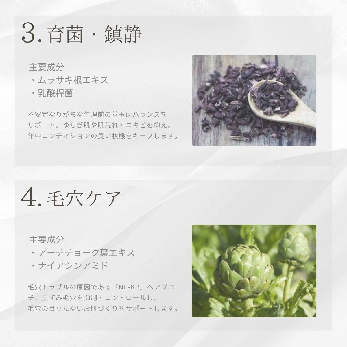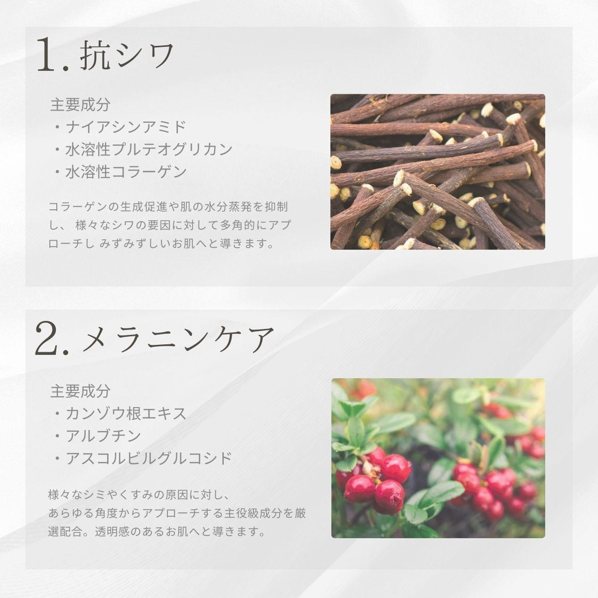 水、グリセリン、ペンチレングリコール、トリエチルヘキサノイン、エチルヘキサン酸セチル、ベヘニルアルコール、BG、ニコチンアミドモノヌクレオチド、ナイアシンアミド、乳酸桿菌、ムラサキ根エキス、ムシゴケ葉エキス、カンゾウ根エキス、セラミドEOP、セラミドNP、セラミドAP、アルブチン、水溶性プロテオグリカン、アスコルビルグルコシド、ビフィズス菌培養溶解質、リンゴ果実培養細胞エキス、水溶性コラーゲン、アーチチョーク葉エキス、オウゴン根エキス、オレンジ果皮油、レシチン、水添レシチン、ステアリン酸グリセリル、ステアロイルグルタミン酸Na、ジメチコン、キサンタンガム、フィトスフィンゴシン、水酸化K、PEG-60水添ヒマシ油、クエン酸、クエン酸Na、コレステロール、カルボマー、(アクリレーツ/アクリル酸アルキル(C10-30))クロスポリマー、ラウロイルラクチレートNa、エタノール、フェノキシエタノール
