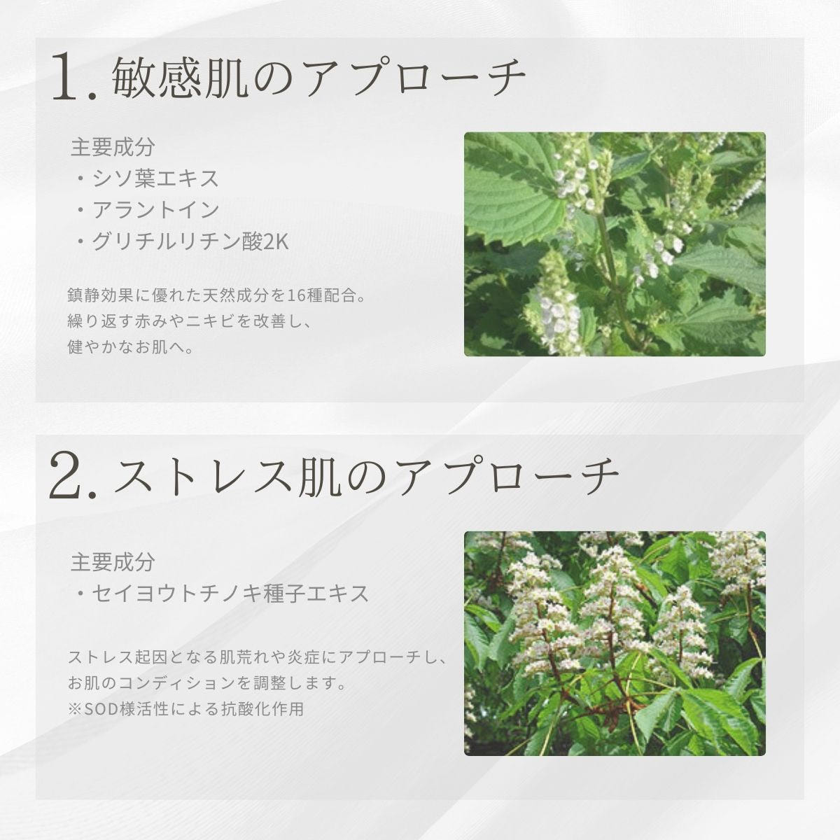 水、BG、ペンチレングリコール、ニコチンアミドモノヌクレオチド、ナイアシンアミド、乳酸桿菌、シソ葉エキス、グリチルリチン酸2K、カンゾウ根エキス、カエサルピニアスピノサ果実エキス,、カッパフィカスアルバレジエキス、カミツレ花エキス、イチョウ葉エキス、ハマメリス葉エキス、アシタバ葉/茎エキス、キハダ樹皮エキス、レモン果実エキス、オタネニンジン根エキス、ローズマリー葉エキス、セイヨウトチノキ種子エキス、アルニカ花エキス、ボタンエキス、オウゴン根エキス、トウキンセンカ花エキス、ローマカミツレ花エキス、チャ葉エキス、セイヨウオオバコ種子エキス、アー+