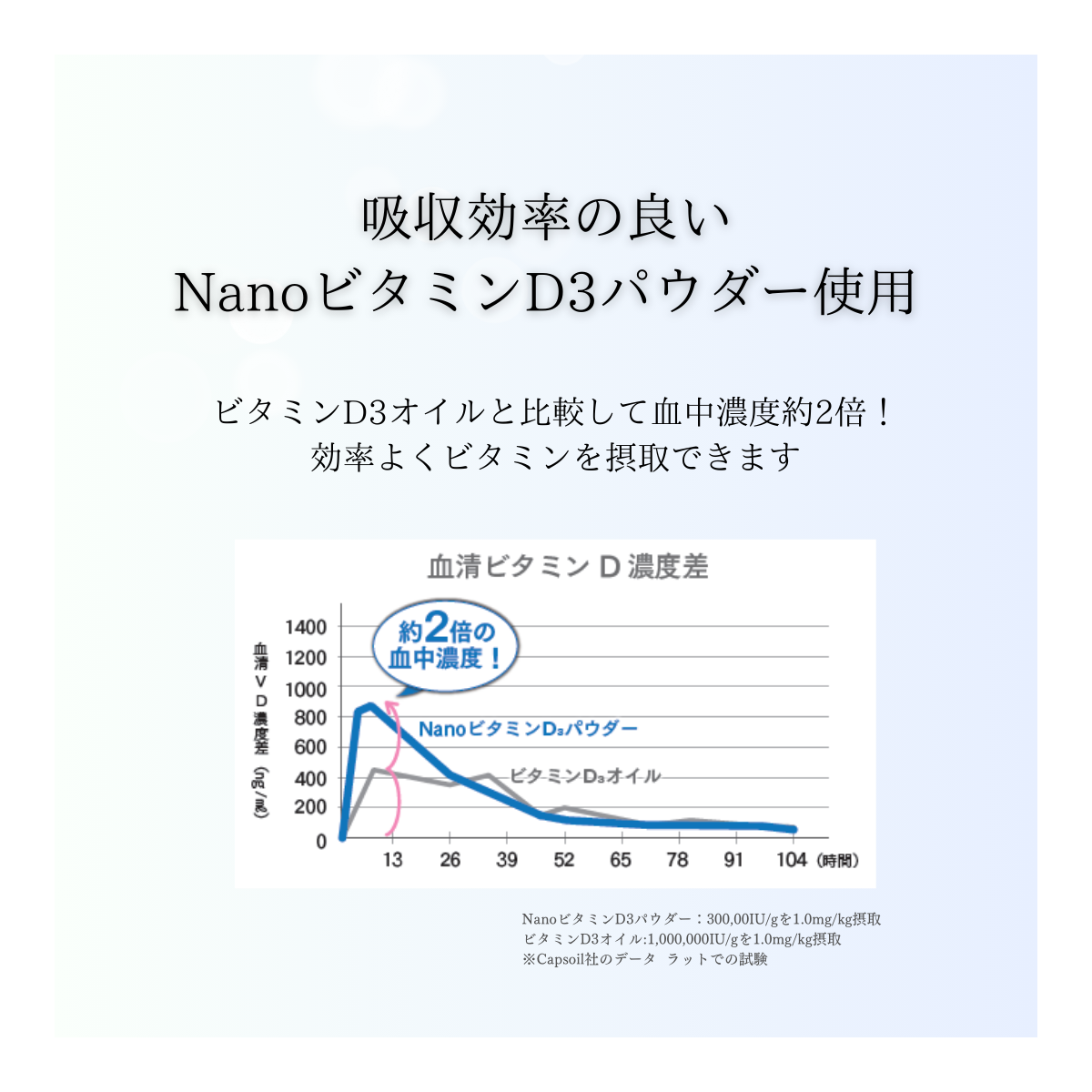一般的なビタミンD3オイルと比べ、「NanoビタミンD3パウダー」では摂取後のピークの血中濃度が約2倍となっております。