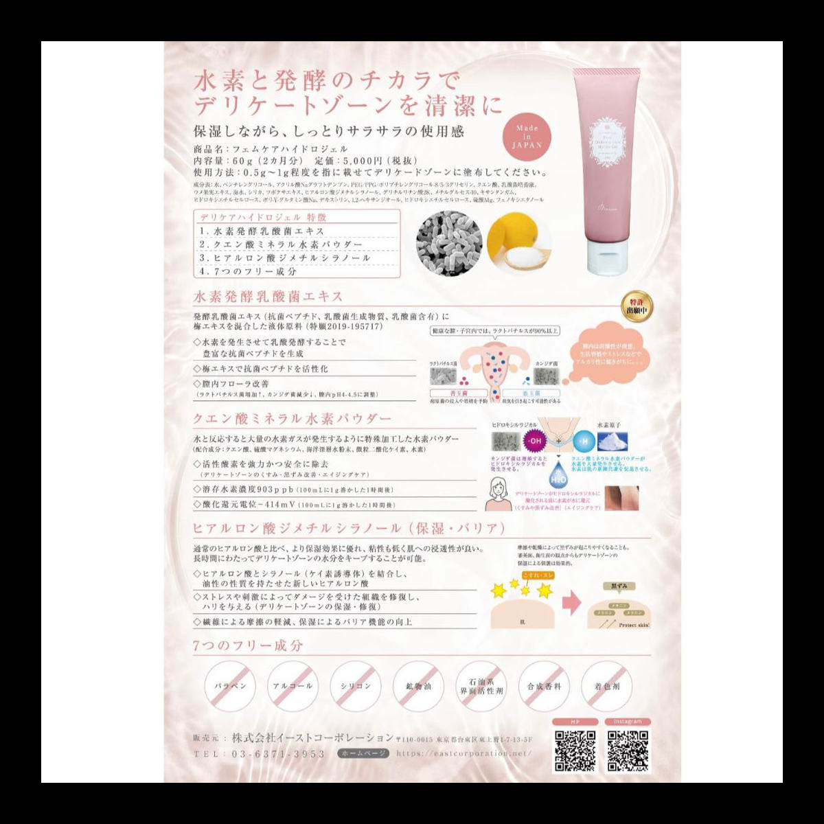 べたつきなく、なじみやすい使用感です。特許出願原料中の発酵乳酸菌エキス、水素発酵乳酸菌エキス、クエン酸ミネラル水素パウダーを配合することにより、清潔で綺麗な状態を作ります。