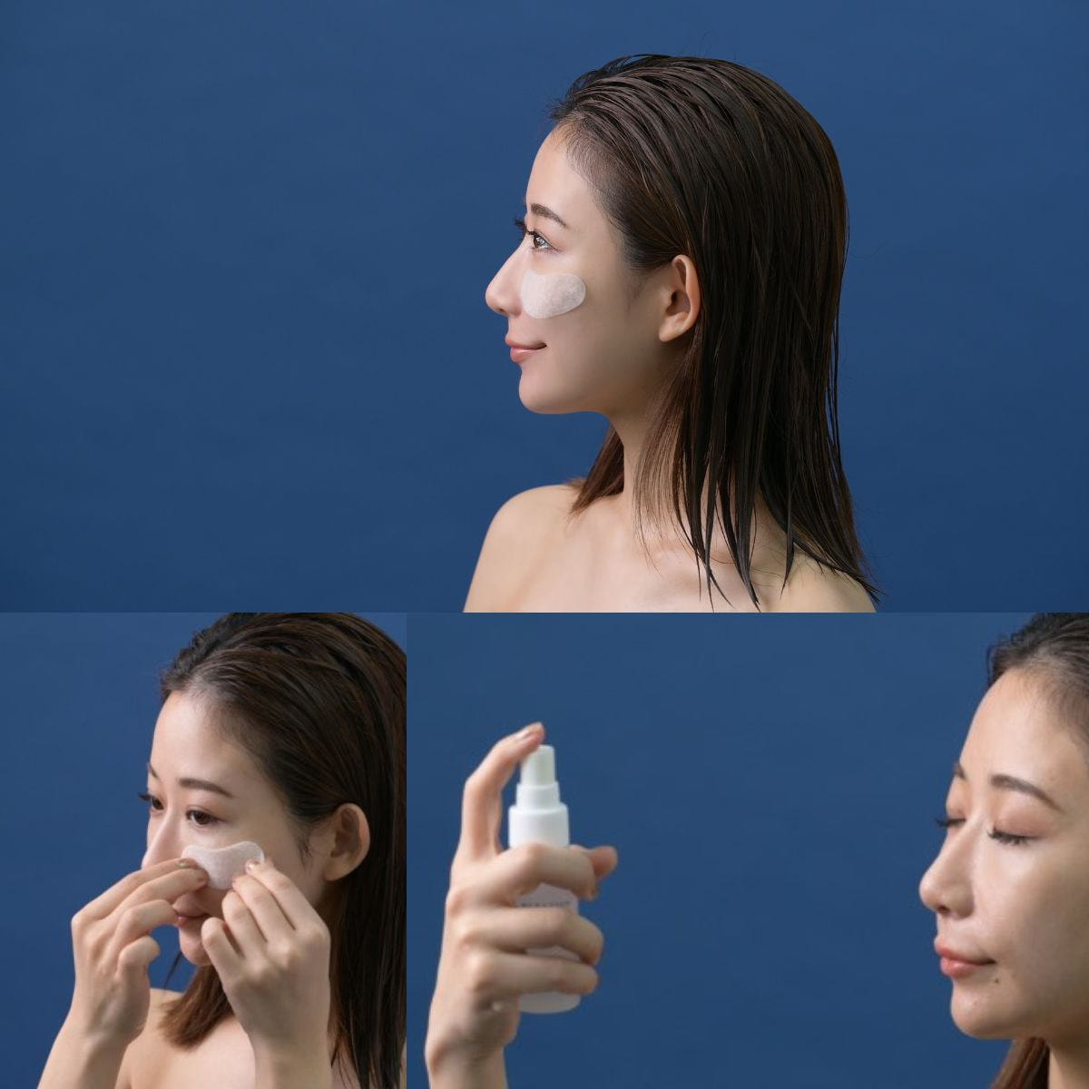 ①お肌を清潔にした後、化粧水で整え、ミストを吹きかけ、しっかりと肌を湿らせます。