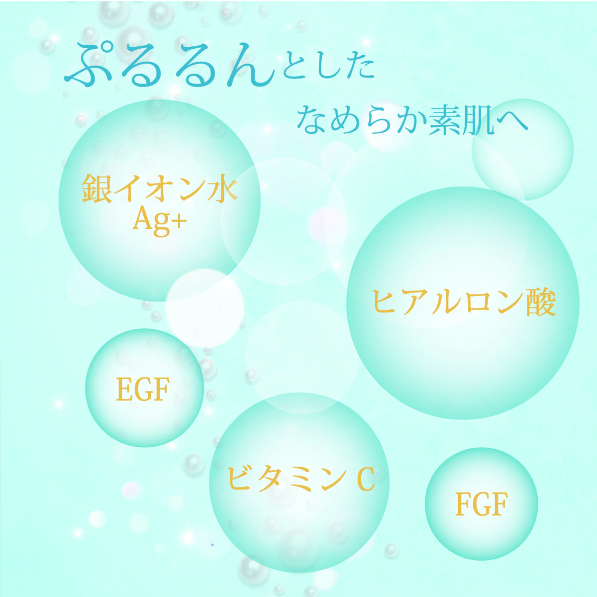 水、ペンチレングリコール、ヒアルロン酸Na、アスコルビン酸Na、ヒト遺伝子組換オリゴペプチド-1、ヒト遺伝子組換オリゴペプチド-11、酸化銀、ホウケイ酸(Ca/Na)、キサンタンガム、BG、1,2-ヘキサンジオール