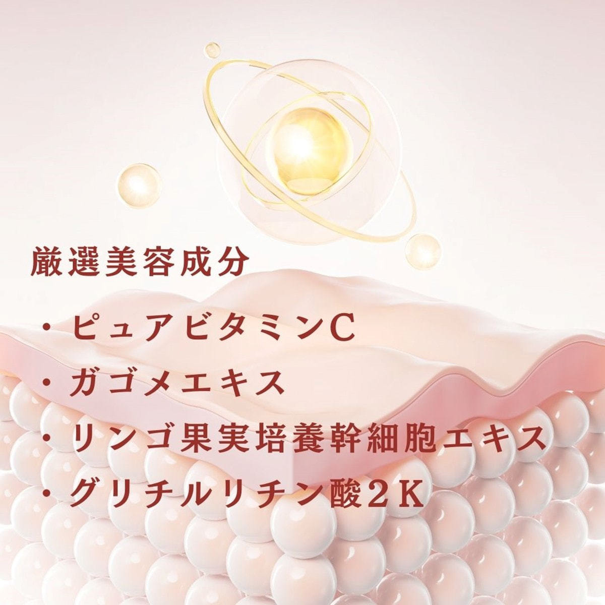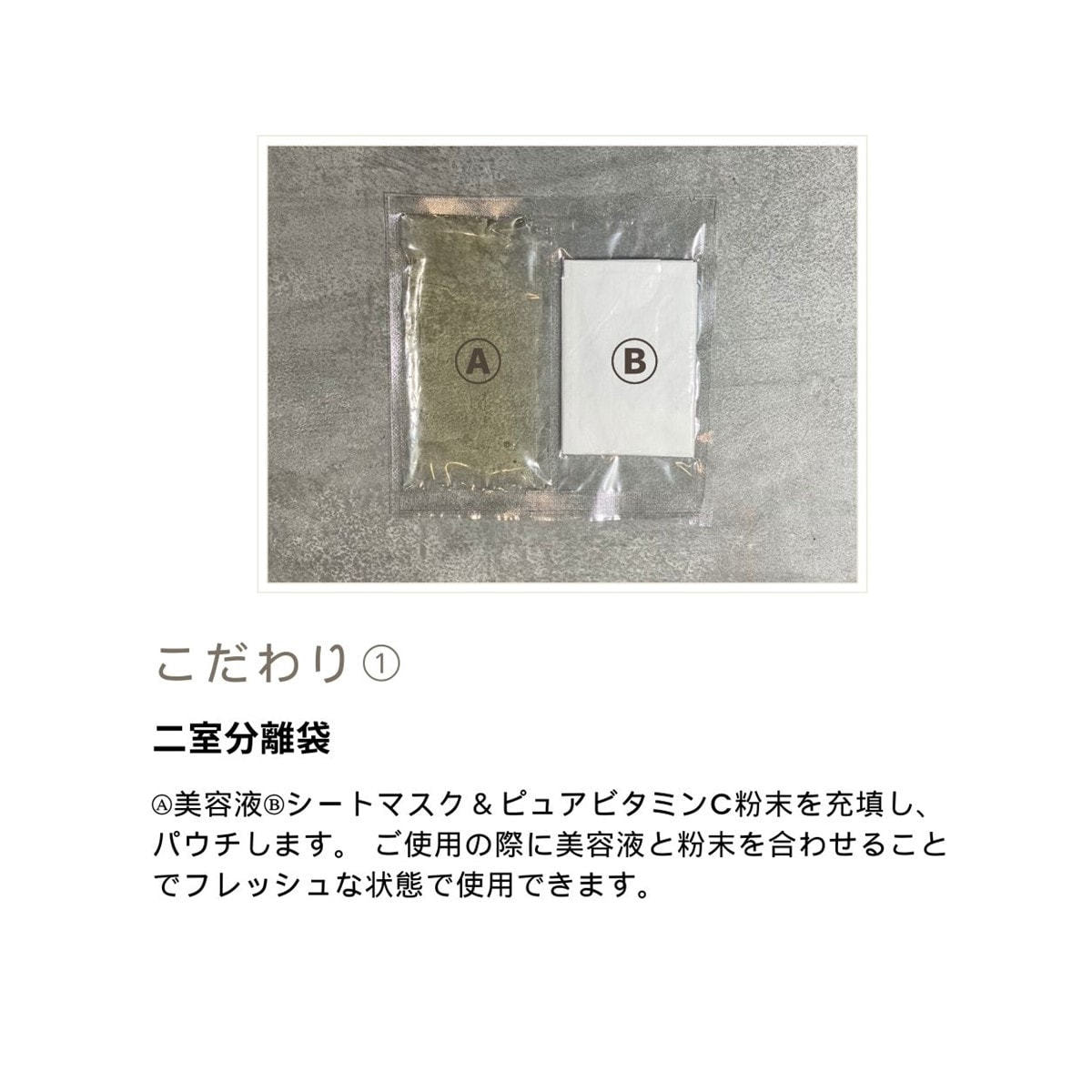 北大ガゴメやリンゴ果実培養幹細胞エキス、グリチルリチン酸2Kなど植物由来の美容液にビタミンC溶かして使用するフレッシュタイプの美容液マスク。