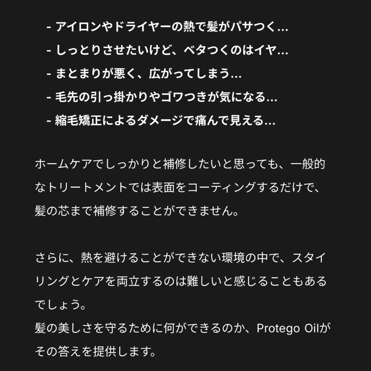 サロン施術後の髪は、美しく健康的な状態に整えられますが、日々のスタイリングや環境の影響で徐々にその美しさが失われていきます。  プロテゴオイルは、 サロンでのケアを自宅でも維持できるよう、髪を守りながら補修するメカニズムを実現。